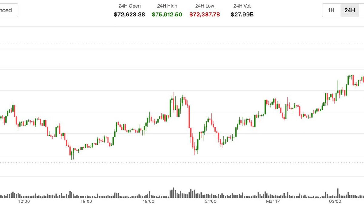 انفجار تاريخي: بيتكوين تتجاوز حاجز 75 ألف دولار في ظل تحولات خطيرة في سوق المشتقات