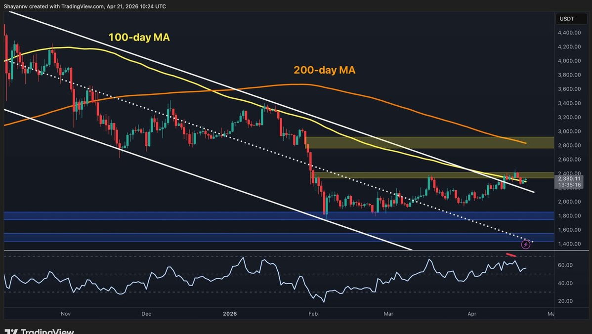 Dark Mode Toggle Ball Crypto News Today Market Updates Margin Trading Guides Videos Price Analysis BTC Analysis ETH Analysis XRP Analysis Bitcoin For Beginners Interviews Editorials DeFi & NFT Buy Crypto Language Bulgarian Turkish Spanish © Copyright CryptoPotato Home » ETH Ethereum is trading around $ 2,350 and is at a pivotal moment that will likely define its trajectory in the weeks ahead. The asset has spent the better part of April building a case for a genuine bullish reversal, and while that is not yet closed, the evidence on multiple timeframes is quietly accumulating in favor of the buyers. The daily chart shows ETH pressing against the $2.4K resistance zone for the third time in recent weeks, with the 100-day MA now converging with the channel’s upper boundary as the price struggles to hold above both. The RSI has also been above 50 for the past couple of weeks, indicating that