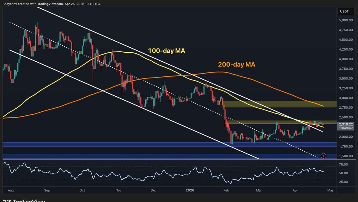 Dark Mode Toggle Ball Crypto News Today Market Updates Margin Trading Guides Videos Price Analysis BTC Analysis ETH Analysis XRP Analysis Bitcoin For Beginners Interviews Editorials DeFi & NFT Buy Crypto Language Bulgarian Turkish Spanish © Copyright CryptoPotato Home » ETH There is a growing tension in Ethereum’s market structure that is worth addressing directly. On-chain, the supply picture is arguably the most constructive it has been in a while. On the chart, however, ETH is still struggling to clear a resistance zone it has now tested four times in six weeks. The resolution of that tension, one way or the other, is likely coming soon. On the daily chart, the story is familiar. ETH is at $2.3k, the descending channel’s upper boundary has been broken, and the price is struggling with the 100-day MA, which is located just below the key $2.4k resistance zone. The 200-day MA (~$2.8k) si