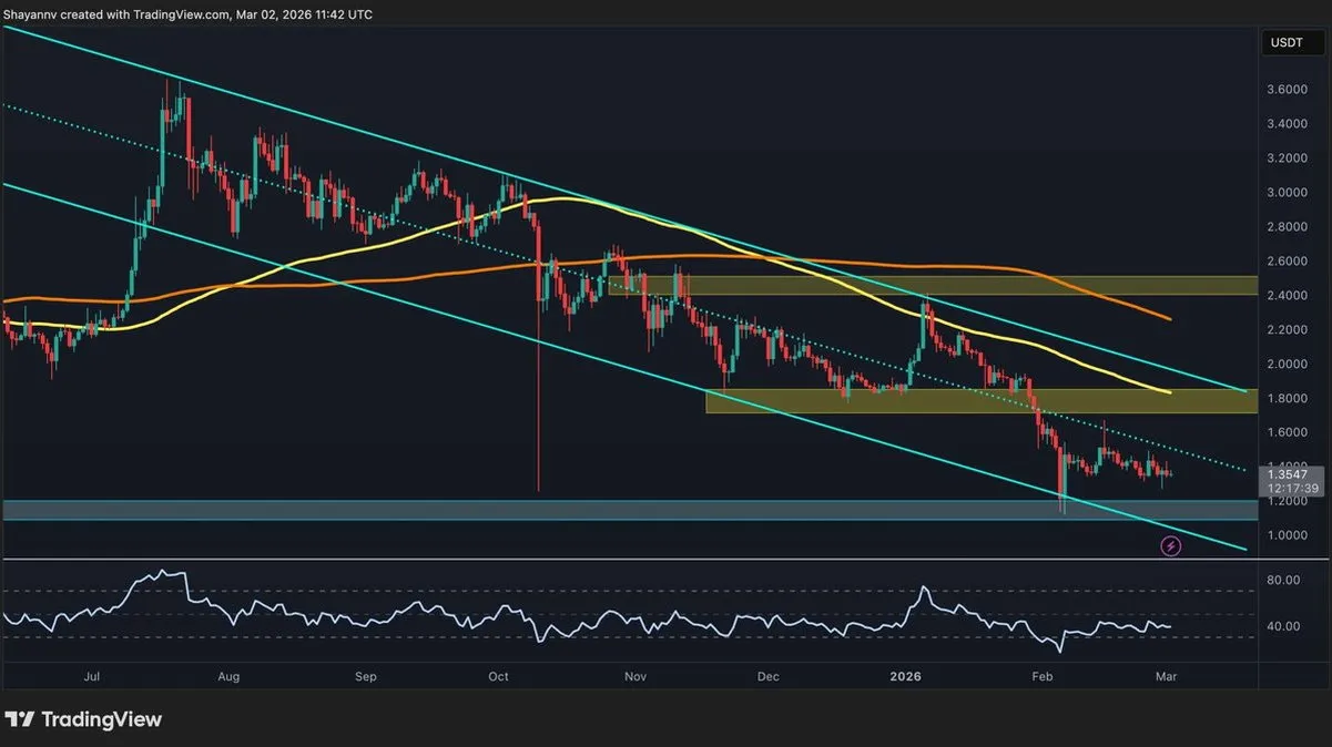 Overhead resistance presents a significant hurdle. The $1.80 area converges with dynamic resistance from key moving averages and the descending channel's upper boundary, creating a concentrated supply zone. A decisive break above this confluence is necessary to signal a shift in near-term momentum. Beyond that, a heavier resistance band awaits between $2.40 and $2.50, a region that has historically catalyzed selling pressure.