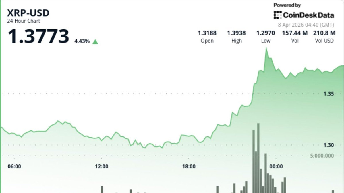 Search/NewsVideoPricesResearchConsensus 2026Data & IndicesSponsoredSearch/enMarketsShareShare this articleCopy linkX iconX (Twitter)LinkedInFacebookEmailXRP zooms 5% on bitcoin strength, but trend reversal still unconfirmedBreakout backed by institutional flows and whale buying, though broader downtrend and weak ETF demand cap conviction.By Shaurya Malwa Apr 8, 2026, 4:49 a.m. Make preferred on What to know: XRP has broken above the $1.37 resistance on strong volume and whale accumulation, but it remains within a broader downtrend, making the move look like a tactical breakout rather than a confirmed trend reversal.Ripple is positioning XRP within a growing stablecoin and Asian institutional ecosystem, highlighting forecasts of $33 trillion in on-chain stablecoin volume by 2026 and deepening ties in Japan through partnerships like SBI Ripple Asia.Traders are watching whether XRP can hold