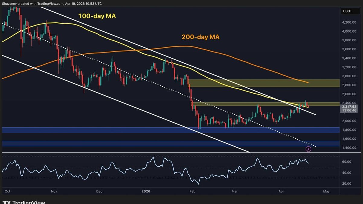 Dark Mode Toggle Ball Crypto News Today Market Updates Margin Trading Guides Videos Price Analysis BTC Analysis ETH Analysis XRP Analysis Bitcoin For Beginners Interviews Editorials DeFi & NFT Buy Crypto Language Bulgarian Turkish Spanish © Copyright CryptoPotato Home » ETH Ethereum is trading around $2.3k, holding near its highest levels since the February crash. Yet, there are signs of short-term fatigue after failing to sustain a breakout above the $2.4k resistance zone. The broader recovery remains intact, but the repeated failure at this ceiling is becoming a pattern that buyers will need to decisively break to shift the narrative. The price is pressing against a genuinely significant confluence on the daily chart, comprised of the 100-day moving average and the $2.4k supply zone. ETH has now closed above the long-term descending channel after months, but it is failing to follow thr