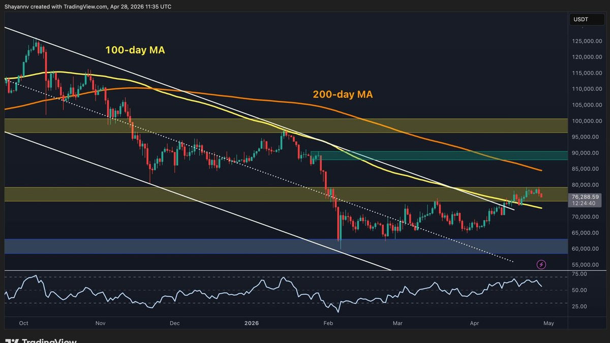 Dark Mode Toggle Ball Crypto News Today Market Updates Margin Trading Guides Videos Price Analysis BTC Analysis ETH Analysis XRP Analysis Bitcoin For Beginners Interviews Editorials DeFi & NFT Buy Crypto Language Bulgarian Turkish Spanish © Copyright CryptoPotato Home » BTC Bitcoin is trading around $76k as April draws to a close. It is sitting at one of the most technically loaded junctures of its entire corrective phase. After clawing back from the February low near $60k, BTC has quietly rebuilt momentum through the mid-$70ks, and with whale-sized spot accumulation now clustering at current levels, the market is asking a pointed question: is the correction that defined Q1 2026 finally over? On the daily timeframe, Bitcoin has broken above the upper boundary of the descending channel that has been in place since the cycle peak above $120k in late 2025. The declining 100-day moving avera