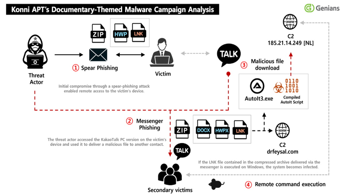 Зафиксирована деятельность северокорейской группировки угроз, отслеживаемой под именем Konni, которая проводит изощренную фишинговую кампанию. После компрометации целей злоумышленники используют доступ к популярному десктопному приложению KakaoTalk для распространения вредоносного ПО среди выбранных контактов жертвы. Согласно анализу южнокорейской компании Genians, занимающейся киберразведкой, первоначальным вектором атаки стало высокотаргетированное фишинговое письмо. Письмо было замаскировано под официальное уведомление о назначении получателя «лектором по правам человека в КНДР» — социально-инженерная приманка, призванная спровоцировать цель открыть вредоносное вложение.