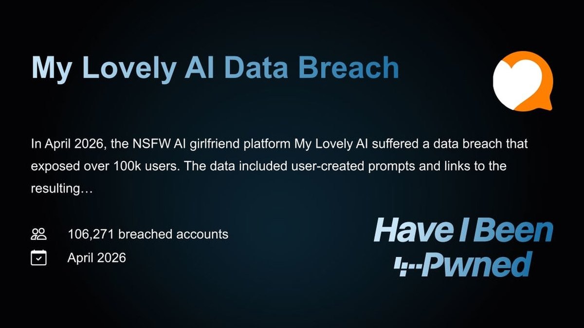 In April 2026, the NSFW AI girlfriend platform My Lovely AI suffered a data breach that exposed over 100k users. The data included user-created prompts and links to the resulting AI-generated images, along with a small number of Discord and X usernames. As this breach has been flagged as sensitive, it is not publicly searchable. To see the exposure of email addresses in this breach, sign in to your dashboard and review results for your email address in the "Breaches" section under "Personal", or search any domains you control in the "Domains" section under "Business". Use a password manager to generate and store strong, unique passwords for all your accounts. 1Password helps protect your data with industry-leading security. HIBP enables you to discover if your account was exposed in most of the data breaches by directly searching the system. However, certain breaches are particularly sen