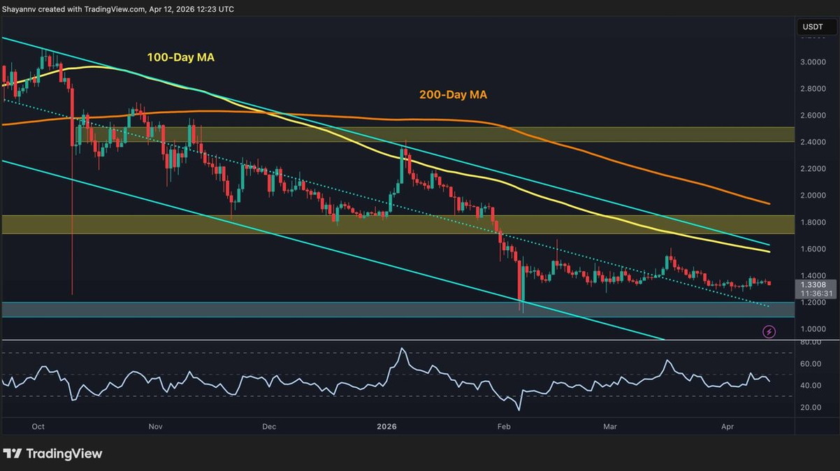 Dark Mode Toggle Ball Crypto News Today Market Updates Margin Trading Guides Videos Price Analysis BTC Analysis ETH Analysis XRP Analysis Bitcoin For Beginners Interviews Editorials DeFi & NFT Buy Crypto Language Bulgarian Turkish Spanish © Copyright CryptoPotato Home » XRP XRP is trading around $1.33 as the altcoin continues to drift lower with no meaningful catalyst in sight. While broader markets are in a wait-and-see mode around the US-Iran ceasefire developments, XRP has found no relief from the pressure. It is sliding further toward the critical support zone that has served as the last line of defense since February. The structure on the USDT pair remains firmly bearish. XRP is trading inside a descending channel with both the 100-day MA (~$1.60) and 200-day MA (~$1.90) declining well overhead. The asset has been grinding lower in a slow bleed that has now brought it uncomfortably